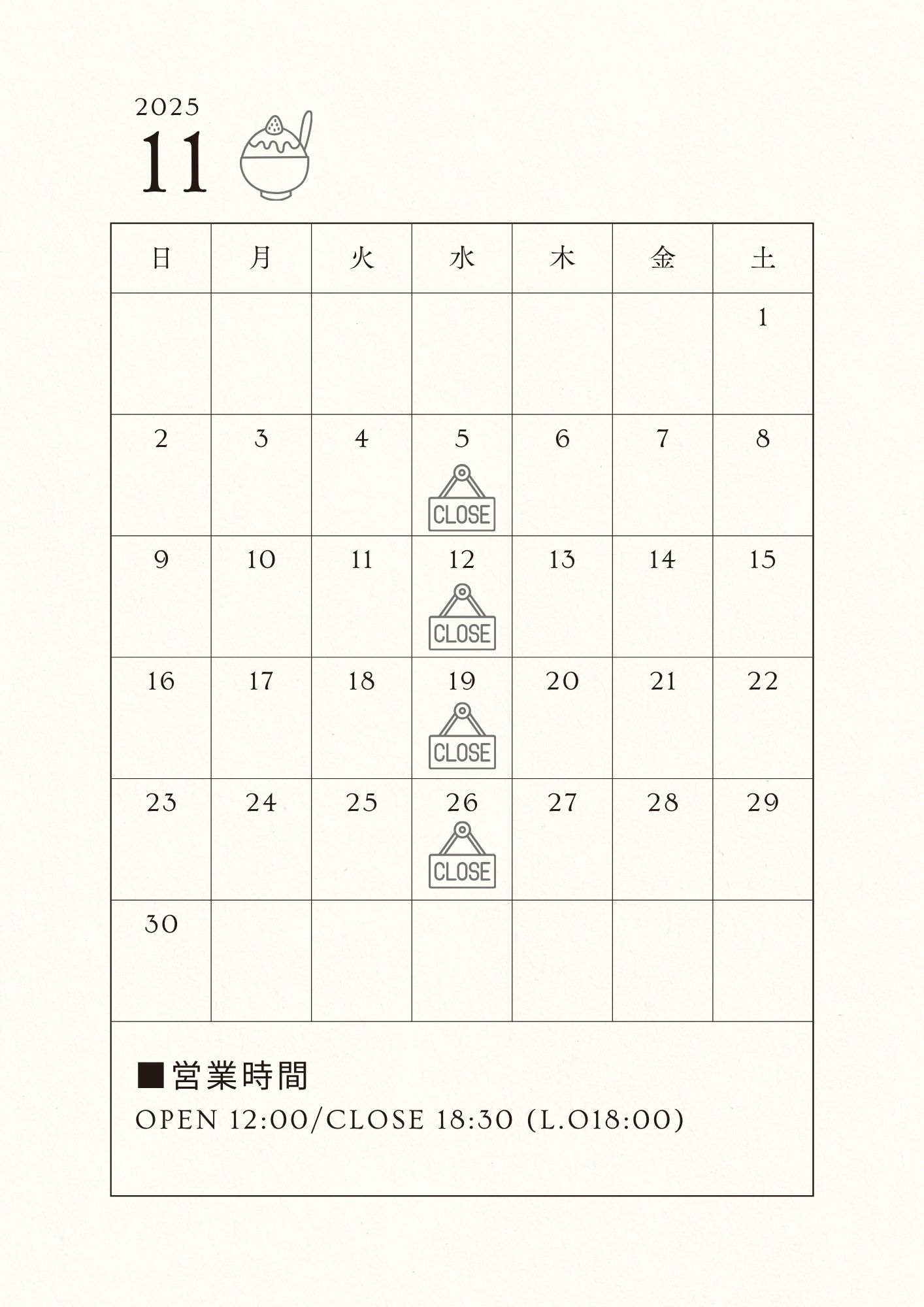 CLOSE 18:30 (L.O 18:00)