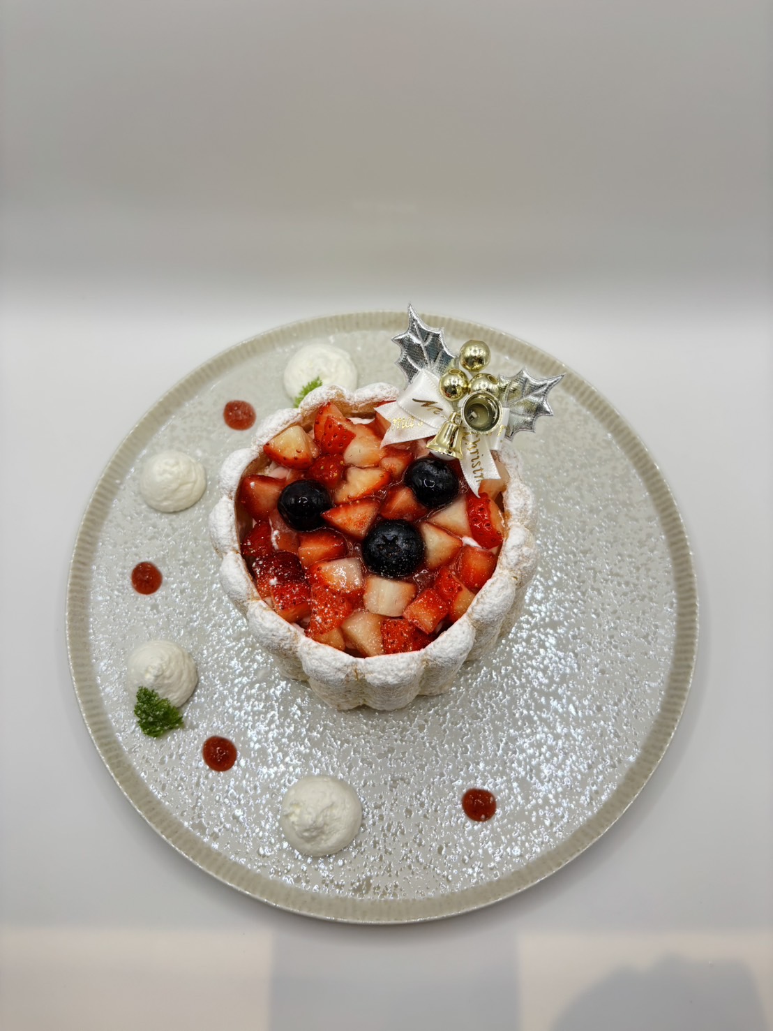 お店で丁寧に仕上げた洋梨のコンポートと、5種類のベリーで作った甘酸っぱいソースをたっぷり使用。 中にはオーム乳業の濃厚カスタードクリームが隠れています。 最後に、フランス産きび砂糖「カソナード」をのせてバーナーでカリッと香ばしく炙った、特別な“冬のかき氷”